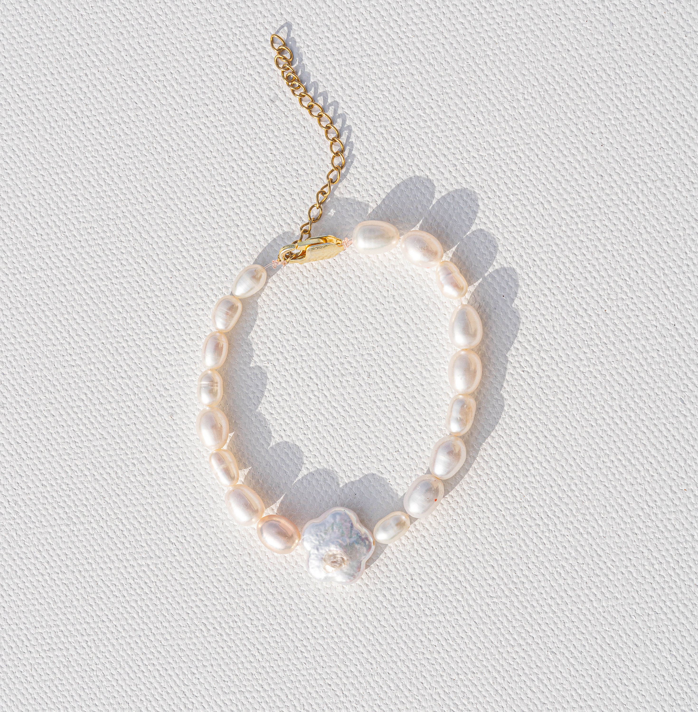 This bracelet features white freshwater pearls surrounding a rare flower shaped freshwater pearl.
