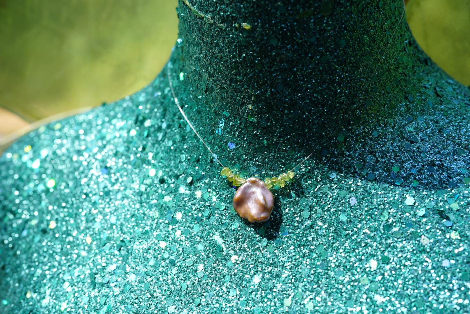 A floating strand of ethereal green glass beads centered with a lavender baroque pearl.