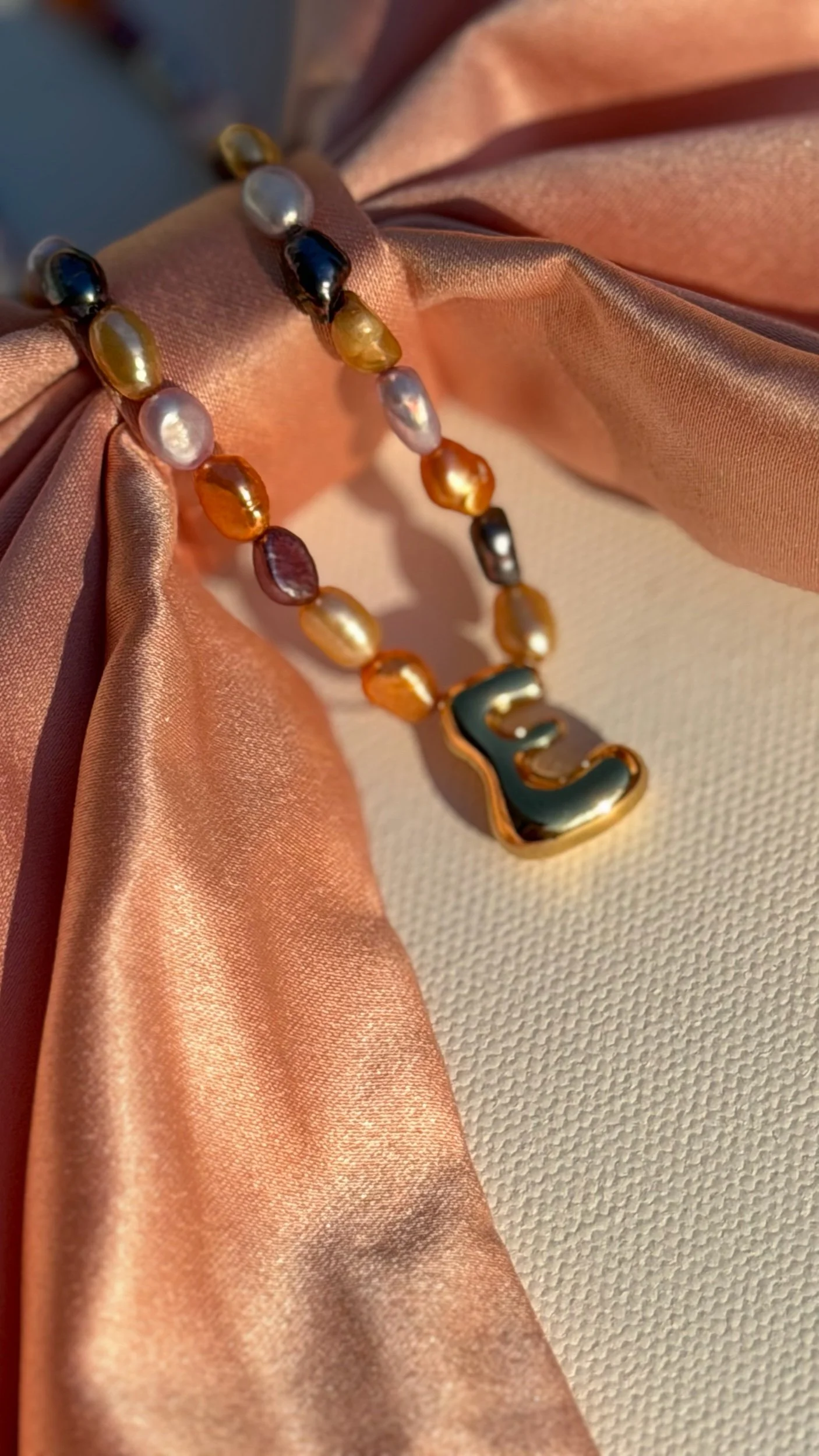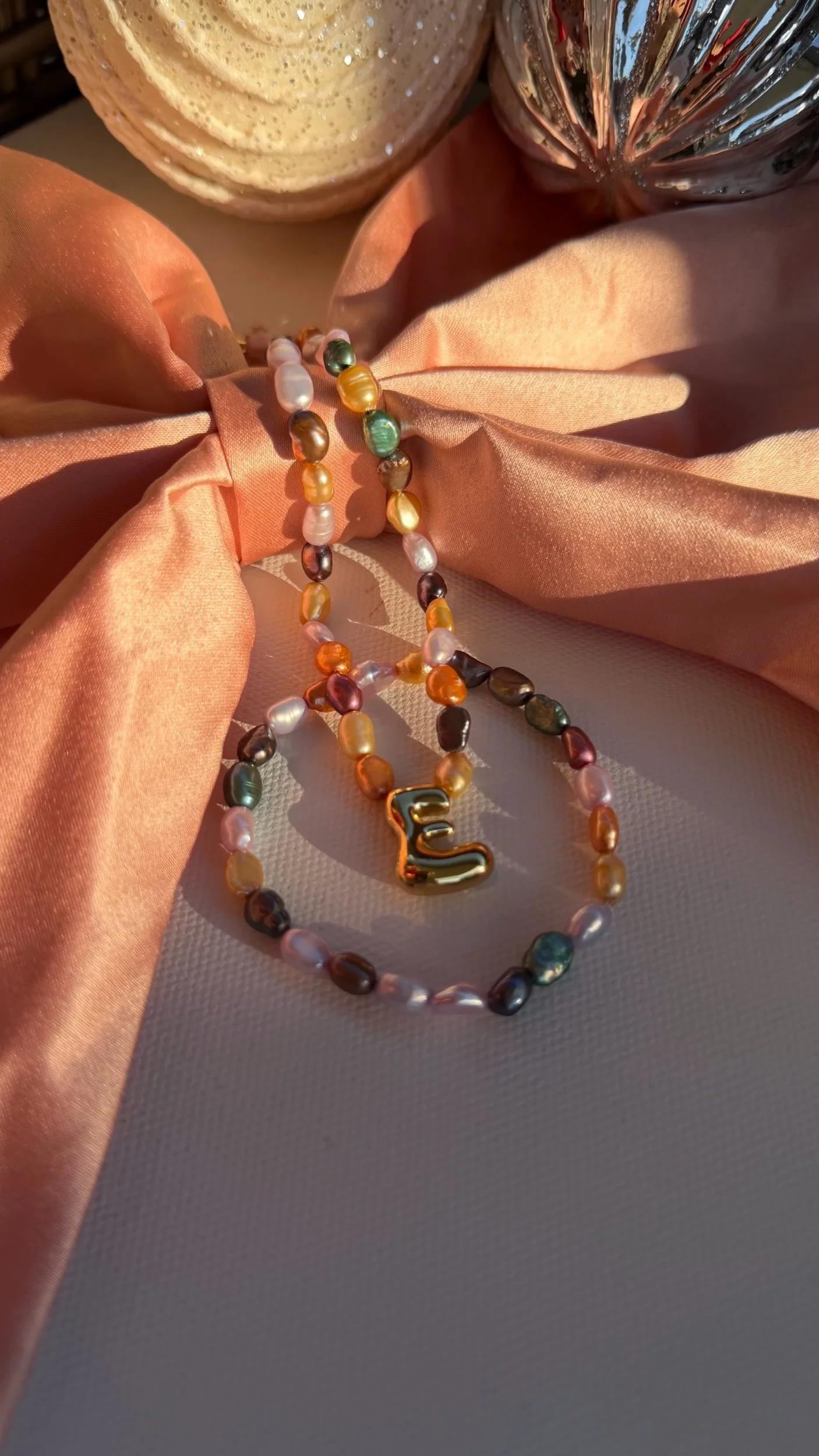 Gold plated initial charm in a “retro bubble” font. These come in a full strand of freshwater pearls fastened with a gold plated lobster clasp and adjustable chain.