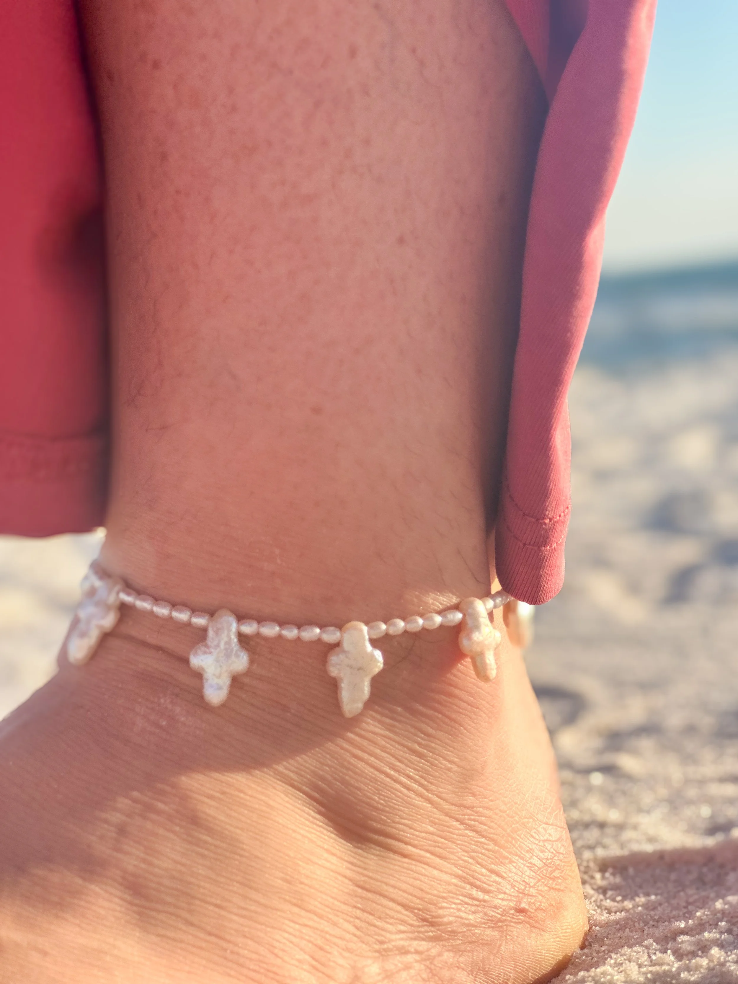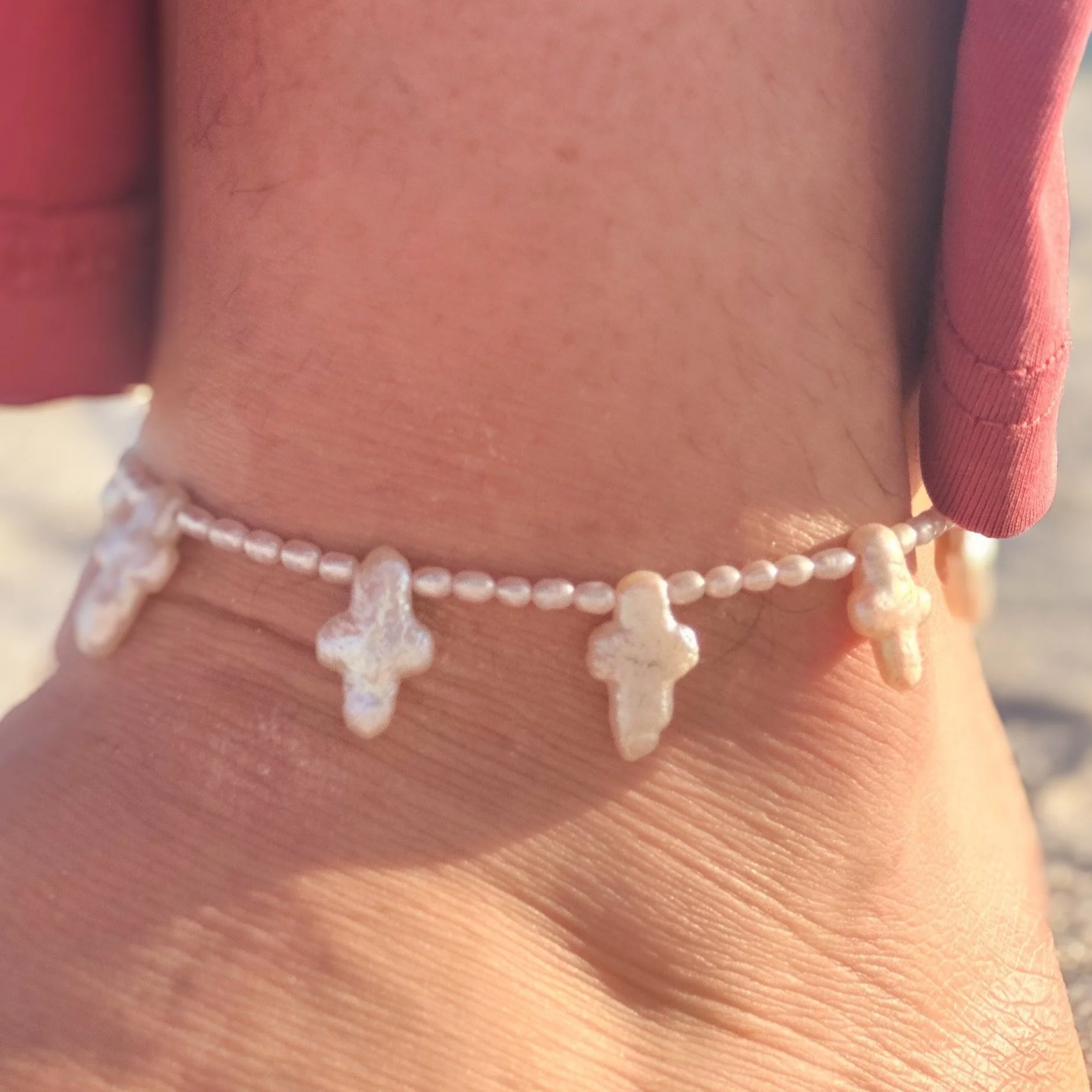 This lightweight anklet consists of one White cross shaped freshwater pearl and tiny white freshwater pearls. Perfect for nonstop wear because it is strung with a 30 pound braided line that is unbelievably durable.